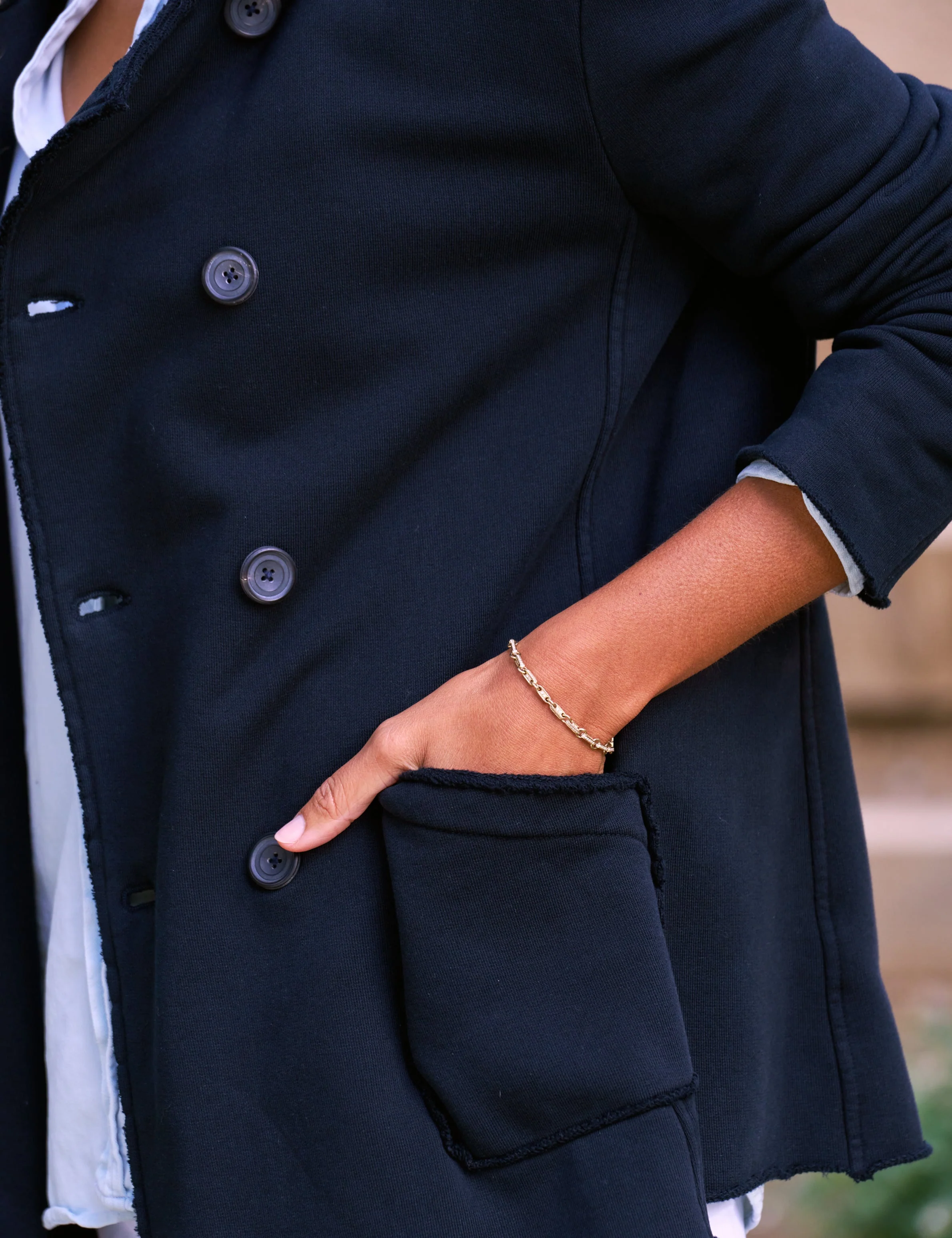 Meet Belfast, our English-peacoat-meets-California-cool jacket designed to toss over a tee and go! Luxurious horn buttons, scrunchable sleeves, a stretchy fit, and statement collar add a pop of California cool to this year-round piece.