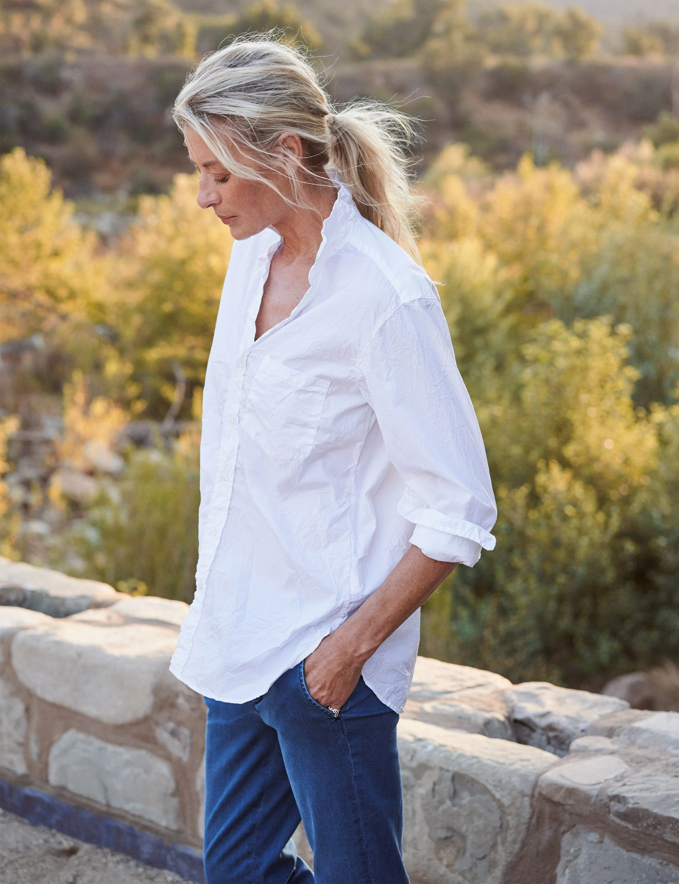 Our menswear-inspired Joedy is intentionally oversized, with extra coverage in the back. A prominent pocket, flattering center-back pleat, and longer hemline make this button-up the perfect length to layer over leggings or jeans.